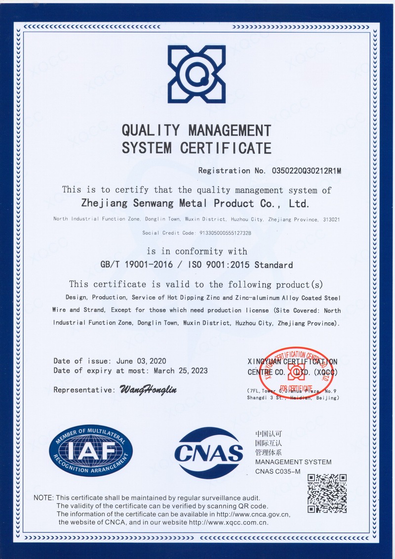 浙江森旺金屬制品有限公司成立于2012年,坐落湖州市吳興區東林鎮工業功能區。公司專業從事各類鍍鋅鋼絲、鋼絞線等產品的開發及生產。目前產品已廣泛應用于各類通信光電纜,電力輸送,電氣化鐵路工程,各類堤壩防護及農業溫室等工程領域。公司秉承“追求卓越品質,創建卓著信譽”的經營理念,始終堅持專業化、規模化的經營模式。